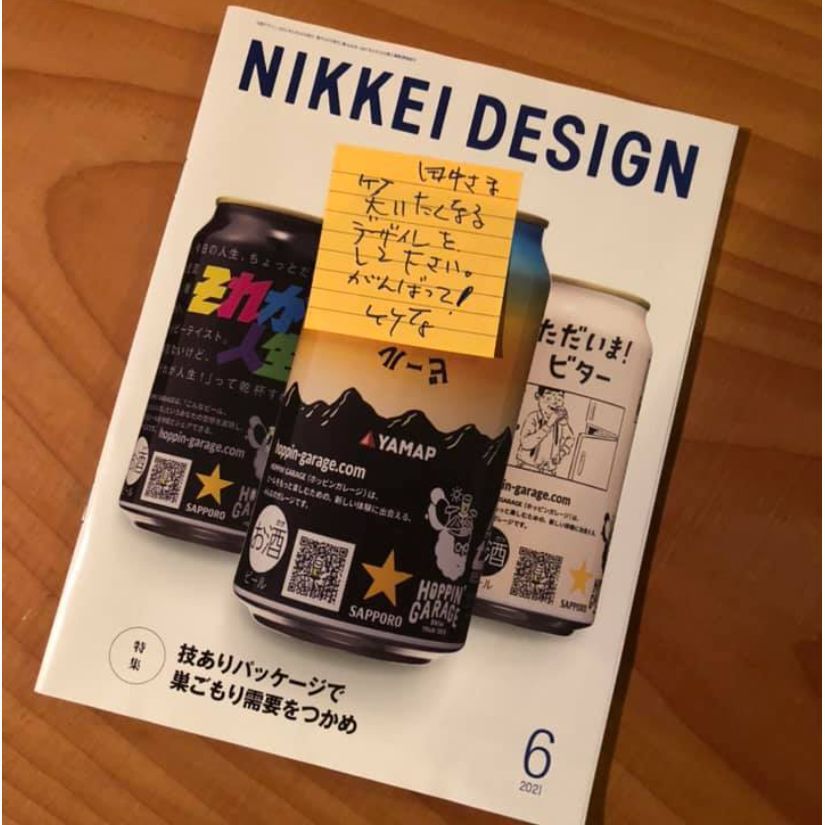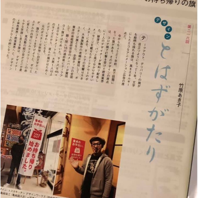 NIKKEI DESIGN 2021.6に、鹿児島・亀崎染工様が染めた「テイクアウトのぼり旗」が竹原あき子様の連載「デザインとはずがたり」にて紹介されました。